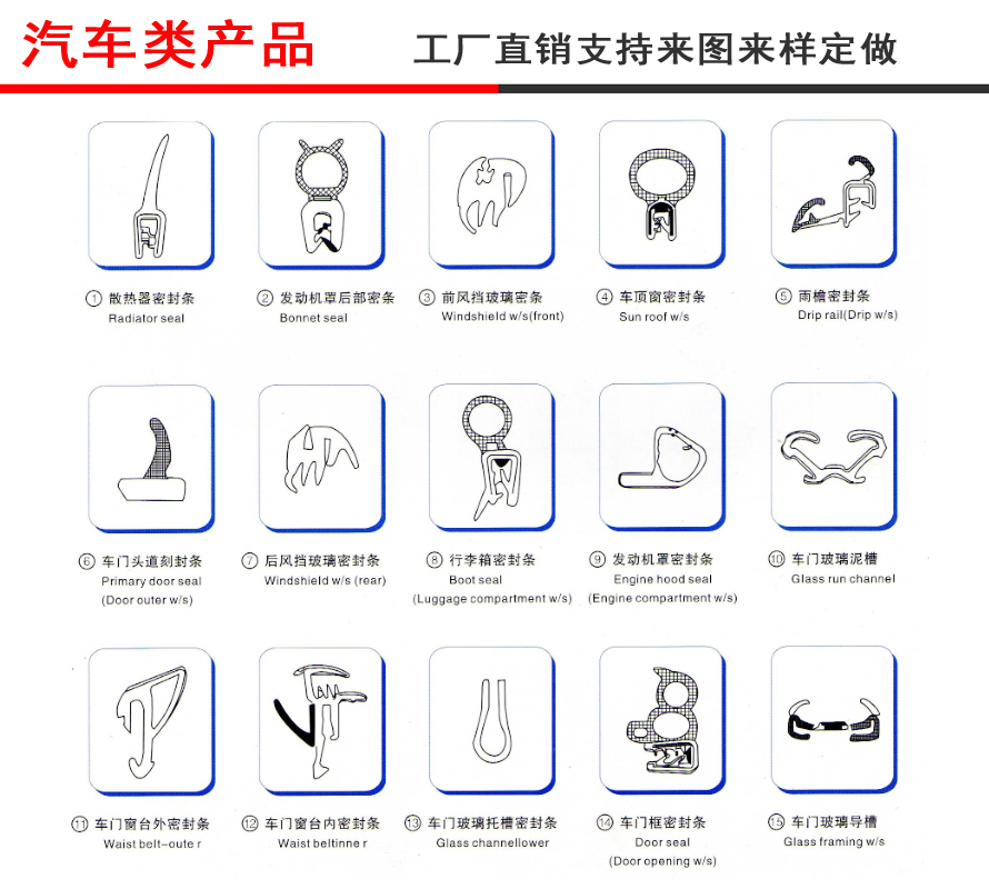 2. 汽車密封條應(yīng)用在車門、車窗、前后檔風(fēng)玻璃、天窗,發(fā)動(dòng)機(jī)蓋和行李箱蓋上,起到防水、防塵、隔音、隔熱、減震、裝飾的作用。